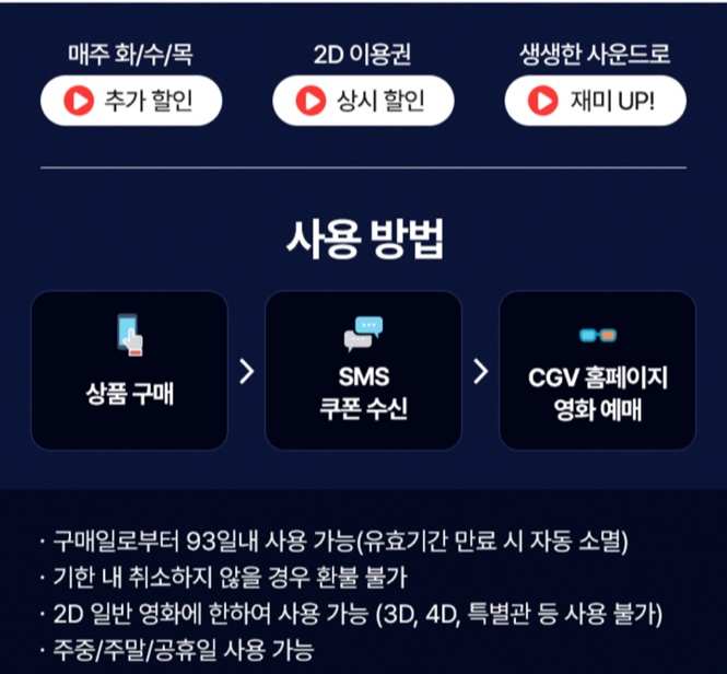 • 2D 일반 영화에 한해서만 사용 가능하며, 3D, 4D, 특별관 등에서는 아쉽지만 사용할 수 없어요.